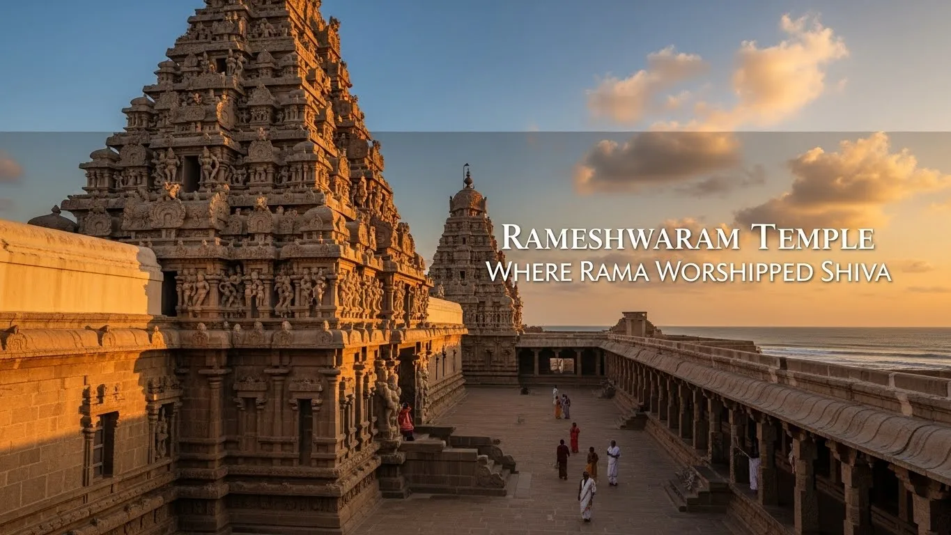 Rameshwaram’s Ramanathaswamy Temple in Tamil Nadu—the sacred twelfth and southernmost Jyotirlinga on an island between India and Sri Lanka where Lord Rama, seventh avatar of Vishnu, after defeating demon king Ravana sought purification from Brahmahatya sin of killing learned Brahmin scholar by establishing and worshipping Shiva, with Sita fashioning the Ramalingam from seashore sand when Hanuman sent to Kailash couldn’t return before auspicious muhurat, and compassionate Rama ordaining that the Vishwalingam brought by disappointed Hanuman be worshipped first (tradition continuing today)—represents