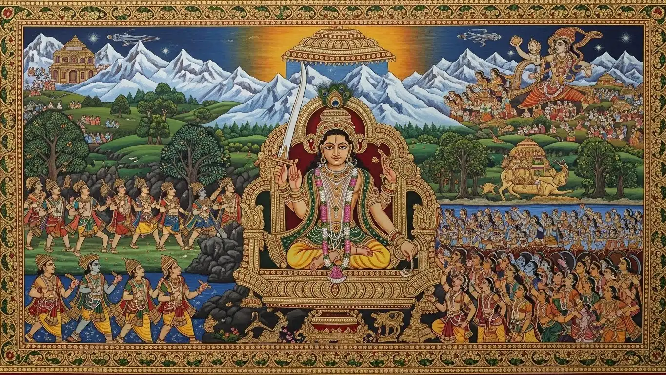 Parvati embraces all six infants simultaneously, and they fuse into one six-headed child with twelve arms—Kartikeya (Skanda, Murugan). He grows to become the divine warrior general who leads the gods’ army and defeats the demon Tarakasura, fulfilling the cosmic purpose for which Shiva and Parvati’s union was necessary.